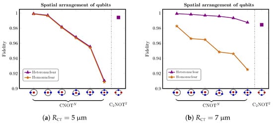 In Figure 11, we show the effect of spatial arrangement and the number of target atoms on the obtained fidelity of CNOT gate for Rabi frequency for two different values of . It is clear that the spatial arrangement of target atoms around the control atom slightly changes the fidelity according to their trapping positions. We also show that the heteronuclear architecture can be advantageous in terms of fidelity as a value for arrays with .