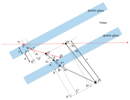 This paper proposed a scattering angle correction method based on geometric optics. As shown in Figure 2, there exists the relationship described in Equations (6)–(16), where is the thickness of the quartz glass of the sample cell; is half of the internal width of the sample cell; is the distance from the detector to the center of the sample cell and is much larger than ; is the angle of incidence of the incident light; is the refractive index of the quartz glass; and is the refractive index of the liquid medium; , , , , are constants; and as described in Equation (12), , and are also constants in a stereotyped measurement system.