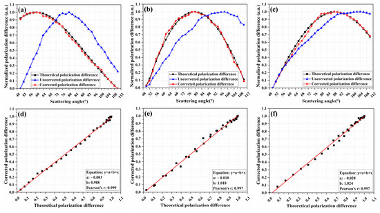 As can be seen from Figure 4 and Figure 5a–c, the uncorrected polarization difference deviates significantly from the theoretical polarization difference, which would affect the accuracy of the particle size inversion. The corrected polarization differences in 350 nm, 200 nm, and 100 nm samples are in high agreement with the corresponding theoretical ones. The corrected polarization differences were linearly fitted to the theoretical ones, and as shown in Figure 4 and Figure 5d–f, the Pearson correlation coefficients (Pearson’s r) of the fitted curves, respectively, reached 0.999, 0.997, and 0.997, indicating a good linear correlation between corrected polarization difference and theoretical polarization difference. Furthermore, the slopes of the fitted curves are, respectively, 0.952, 1.018, and 1.029, and the intercepts are, respectively, 0.019, 0.01, and −0.031. Therefore, the analysis of Pearson’s r, slope, and intercept indicate that the corrected polarization difference is not only linearly related to the theoretical one but also highly consistent in value.