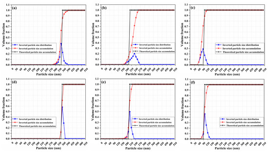 Shown in Figure 5 are the inversion results of the 350 nm, 200 nm, and 100 nm samples, where a, b, and c are the results inverted from the polarization differences with low angular resolution, and d, e, and f are the results inverted from the polarization differences with high angular resolution. The blue curves are the inverted particle size distribution curves, the red curves are the inverted cumulative distribution of the particle size, and the black curves are the theoretical cumulative distribution of the particle size.