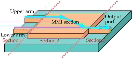 Figure 3a shows the waveguide configuration of the 1 × 2 active MMI LD involving different lasing paths in a cavity for each spatial mode. In Section 1, when the upper arm and lower arm are both designed as fundamental mode waveguides, the two different lasing paths do not share the same output port. As the BPM simulation results show in Figure 3b,c, each path for the fundamental mode is designed as cross-propagation in Section 2. The coupling area for the two fundamental modes is only the MMI area. The coupling efficiency and its variation are small. With the aim of solving this problem, different lateral modes are utilized. As shown in Figure 3d, the first-order mode propagates in the bar direction in Section 3. Thus, two different lasing paths exist, whereas the output port is shared. As shown in Figure 3b–d, despite the presence of optical leakages in the absent upper output section, the majority of the incident light will be confined within the single waveguide in Section 3. The optical loss is less than 1 dB. Consequently, the impact on modulation is anticipated to remain minimal.