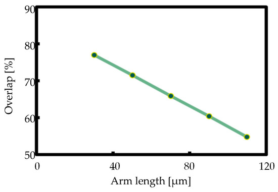 Based on the discussion above, the is determined by the proportion in the active MMI LD configuration. The length of the MMI area is set at 240 μm. The relationship between the length of the arm part and is depicted in Figure 5. can be set from 0.5 to 0.8.