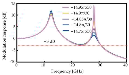 Although the modulation bandwidth extension is confirmed by the existence of PPR, it is worth noting that the PPR intensity stands at approximately 14 dB, which is regarded as a detrimental factor affecting large signal modulation. In order to address this issue, it is important to devise a control scheme to manage the intensity. In the PPR model proposed in Section 2, the PPR phenomenon is treated as a synchronization phenomenon. Based on synchronization theory [27], it is strongly related to the initial phase of two oscillations. The simulation results, which depict the characterization of the PPR at 0.75 under varying initial phase differences, are presented in Figure 7. When the initial phase difference is −14.95π/30, the peak in PPR is observed at 14 dB. The intensity of PPR is reduced with the change in the initial phase difference ranging from −14.95π/30 to −14.75π/30. When the initial phase difference is −14.75π/30, the intensity of the PPR is 0 dB. The fluctuation in the PPR intensity suggests that the PPR phenomenon may not manifest under certain circumstances, primarily due to the absence of optimal tuning in the initial phase difference between the two lasing modes. As 0.75, an 8 GHz improvement with a lower PPR intensity is confirmed, as shown in Figure 7. To tune the initial phase, it is imperative to implement separate current injections for each waveguide within Section 1 of this active MMI LD. The initial phase is then adjusted when operating the current value.
