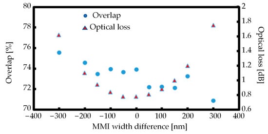 Finally, the fabrication tolerance is discussed. The single output port in Section 3 of the active MMI LD configuration relies on the self-image phenomenon in the MMI section, which is significantly affected by the width of the MMI section [26]. With a fabrication error, the overlap between the two modes and the optical loss will be affected, which can impact the laser performance. Therefore, the optical loss and the overlap variation with the width difference are calculated, and the results are shown in Figure 10. The optical loss of the optimum active MMI LD is 0.78 dB. It rises with the increase in the width difference. When the width difference is within ±150 nm, the optical loss is below 1 dB. Regarding the overlap, with the width difference of ±150 nm, the overlap is stabilized within the range from 72% to 74%. Given that the overlap and the optical loss at a width difference of ±150 nm remain minimal, the fabrication tolerance of the active MMI LD is ±150 nm.