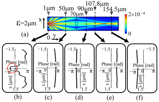 Phase distribution at each measurement point (ε = 2 μm). (a) Distribution of electromagnetic field strength. (b) Phase distribution at 1 μm. (c) Phase distribution at 50 μm. (d) Phase distribution at 90 μm. (e) Phase distribution at 107.8 μm (focal point of this lens). (f) Phase distribution at 154.5 μm (image plane of this lens).