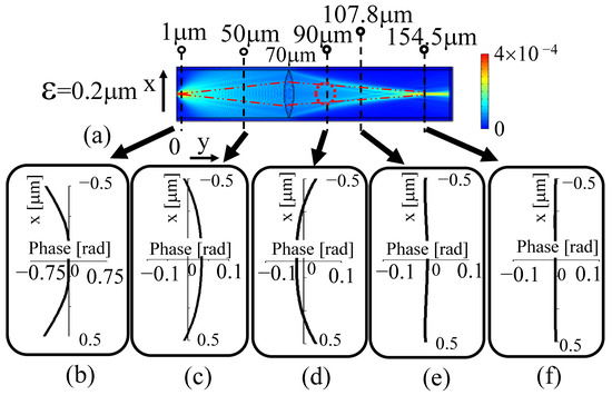 Phase distribution at each measurement point (ε = 0.2 μm). (a) Distribution of electromagnetic field strength. (b) Phase distribution at 1 μm. (c) Phase distribution at 50 μm. (d) Phase distribution at 90 μm. (e) Phase distribution at 107.8 μm (focal point of this lens). (f) Phase distribution at 154.5 μm (image plane of this lens).
