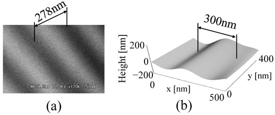 The results of the observation of a reflective diffraction grating with a periodic structure of 278 nm, in which the period observed using SEM exceeded the diffraction limit, are shown in Figure 7a. Figure 7b shows the results of measuring this reflection-type diffraction grating using the optical system shown in Figure 2a. Furthermore, this method can be used not only to observe the microstructure of the repeating structure shown in Figure 7 but also to capture three-dimensional structures, such as microspheres and microcharacters [22], as reported previously.