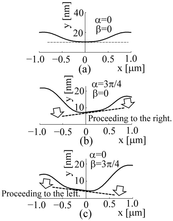 The different phases of α and β on the left and right in Figure 10a,b, 0 and 3π/4, show that the slope of the detected phase distribution changed from 2.96 (nm/μm), as shown in Figure 10a, when the wavefront travelled in the right direction, to −3.13 (nm/μm), as shown in Figure 10b, when the wavefront travelled in the left direction. The absolute value of the slope changed slightly, but the sign also changed. The difference between the phases of α and β could be confirmed by checking the phase distribution at 90 µm.
