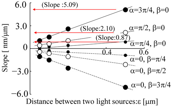 In other words, the results in Figure 11 show that the slope of the wavefront varies with changes in the phase of the light source and with the distance between the light sources, which is related to the position of the light source. In this case, according to the calculations presented in this study, because the changes were limited to a minute range, it was found that there was a proportional relationship between the intensity of the light sources and the slope of the wavefront. Furthermore, the changes in the phase of the light sources and the slope of the wavefront shown by the large●, large◯, and small● were slope = 5.09 nm/μm for the large●, slope = 2.10 nm/μm for the large◯, and finally slope = 0.87 nm/μm for the small● shown in brackets for ε = 0.5 μm when β = 0. It can be seen that the slope was approximately related to the magnitude of the phase α of the light source (π/4, π/2, 3π/4).