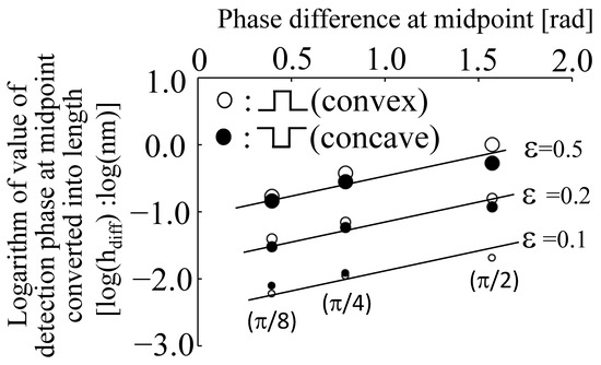 Figure 13 shows the results of the phase advance and delay states in the near optical axis in the phase difference between L1 and L2, with L3 shown on the horizontal axis, converted to the length h, with the parameters of the distance between the light sources ε set to 0.1, 0.2, and 0.5 μm, as shown in Figure 12. As the values obtained in the simulations were very small, the characteristics were compared by expressing the length values as a function of the phase change using logarithms. It was found that the phase change increased as the distance ε between the light sources increased from 0.1 to 0.2 and 0.5 µm. It can also be shown that the detected length h increased as the phase difference increased from π/8, π/4, and π/2 rad. Furthermore, when L1, as indicated by the white circle, was in a positive phase with respect to L2 and L3 (with the shape of the measured object protruding), it was slightly larger than in the case where the phase was lagging, as indicated by the black circle (the shape of the measured object was depressed).