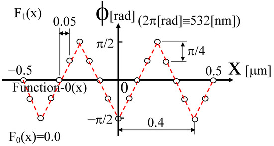 That is, a simulation was performed with an object consisting of 21 light sources with a period of 0.4 μm. The phase of each source changed in the range of −π/2 to π/2, being continuously and closely adjacent at 0.05 μm beyond the diffraction limit, as shown by the red dashed line in Figure 14. A phase distribution at a position of 90 μm was detected.