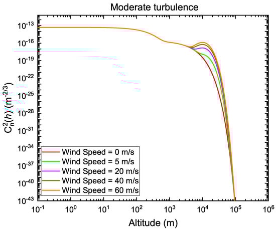 where is the ground wind speed. The simulated wind speeds correspond to ground wind speeds ranging from zero to 43 m/s (zero to 154.8 km/h). By selecting this range of wind speeds, it is possible to simulate the optical link under various weather conditions (zero m/s during a calm summer day, 154 km/h during a storm). For different wind speed values, the (h) profile is modified only for an altitude between 5000 m and 20,000 m according to the Bufton model as shown in Figure 2. It’s important to note that weak and strong turbulence exhibit the same behavior.