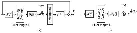 Therefore, the input data are complex multiplied by the estimated phase, where the resulting corrected signal will be , where is the estimated phase. Thus, to obtain the estimated phase error value without approximation, a moving averaging filter (MAF) followed by the four-quadrant arc-tangent function is applied to the power moment of the sampled signals. Then, the estimated phase error can be expressed as: