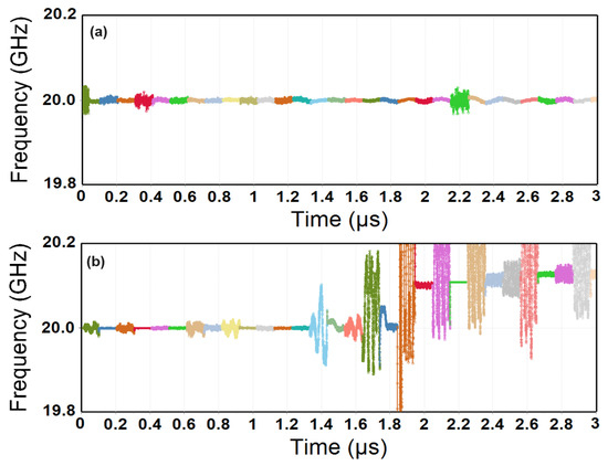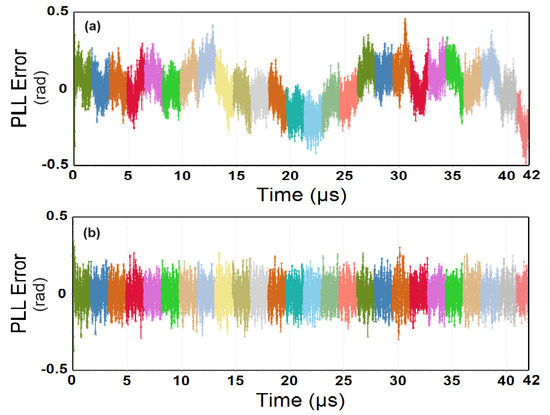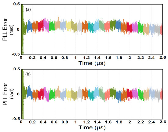 Figure 6 shows the discriminator output behavior under several values of with an MAF of 10 coefficients. These conditions were simulated for an SNR of 15.5 dB at an SR of 10 Gsa/s, where each color represents one iteration, totaling 25 iterations. Figure 6a,b shows the output behavior for a of 0.025 MHz and of 1 MHz where the and , respectively. Reducing the parameter lowers the phase-error variance. However, the parameter is reduced by lowering the value, which lowers the (natural frequency) and slows the OPLL. As a result, it cannot correctly follow the laser variations, as shown in Figure 6a, which shows a fluctuation. This effect is even more pronounced using the SR of 625 MSa/s, which will be discussed next.