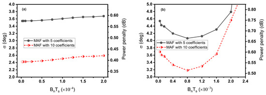 These analyses were carried out with an SNR of 15.5 dB, corresponding to a BER of . Furthermore, eleven values were considered, with each value at both sampling rates analyzed using the MAF with 5 and 10 coefficients. For each value of , the OPLL was subjected to 25 iterations to obtain several samples of the standard deviation of the phase error. An average of these 25 standard deviation values was then calculated.
