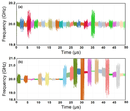 VCO output frequency behavior under strong turbulence and wind speed of 60 m/s for the OPLL working with SR of 10 GSa/s. (a) OPLL using the proposed digital phase detector, (b) OPLL using the sinusoidal discriminator.