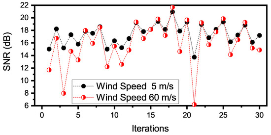 SNR level variations for wind speeds of 5 m/s and 60 m/s under strong turbulence. Each point represents a turbulence event totaling thirty different values or thirty iterations.