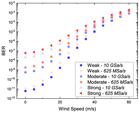 The effect of wind speed on system performance was also investigated in both SRs due to the proposed phase detector’s tracking capability under fading regimes. Thus, the BER fluctuation according to wind speed in three different turbulent conditions (weak, moderate, and strong) is shown in Figure 12. The OPLL at an SR of 625 MSa/s shows a higher degradation compared to the OPLL at 10 GSa/s, as it exhibits a higher power penalty, as previously discussed. In Figure 12, each point represents the average BER calculated for thirty different events. Therefore, by simulating only thirty events, it was evaluated that the results were representative. As a result, the error caused by the number of simulated events may be negligible, where it was chosen as a compromise between results and simulation time.