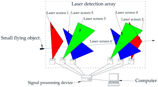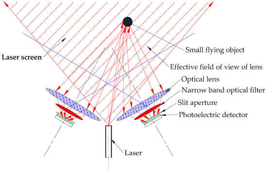 In this research, we develop a measurement system with a six-screen detection array to obtain the three-dimensional velocity vector and the impact coordinates of a small flying object. The proposed system is mainly composed of a laser detection array, a signal-processing device, and a computer, as shown in Figure 1. In this system, the laser detection array consists of six detection units. The detection principle of a single detection unit is shown in Figure 2. When a small flying object passes through a detection area (also called a laser screen), a part of the reflected laser is received by a receiving device equipped with an optical lens, filter, slit diaphragm, photodiode, and signal-processing circuit. This causes the photocurrent of the photodiode to suddenly change. After the circuit processing, a trigger signal is generated [14,15]. Different wavelengths of lasers can distinguish adjacent LED detection arrays combined with narrow band filters [16]. In order to output the trigger signals in the effective detection area, this system must have sufficient sensitivity, which mainly depends on the laser power, the size of the flying object, and the height of the trajectory. Therefore, we can adjust the laser power and the amplification factor of the signal amplification circuit to ensure the detection performance of the flying object in the effective detection area.