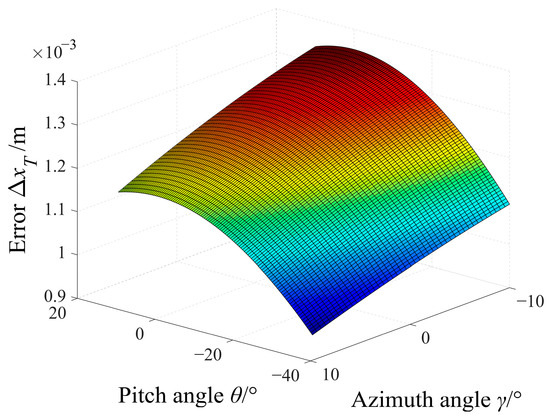 It can be seen from Figure 8 and Figure 9 that θ and γ are respectively in the range of −40° to 10° and −10° to 10° when |v| is set to 700 m/s. In addition, the maximum xT error does not exceed 1.2 mm and the maximum yT error does not exceed 1.3 mm. Moreover, the variation trends of ΔxT and ΔyT with θ and γ are the same as those in Figure 6 and Figure 7, but the errors are smaller.