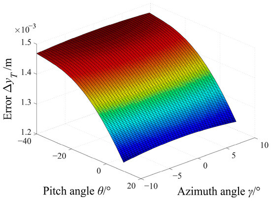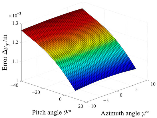 As can be seen from Figure 6 and Figure 7, the maximum error of the impact coordinate xT is not more than 1.4 mm when θ and γ are in the range of −40° to 10° and −10° to 10°, respectively. When θ is from −40° to 10° and γ is invariant, ΔxT first increases and then decreases and has a maximum at about 0° of θ. In addition, when θ is invariant and γ is from −10° to 10°, ΔxT gradually decreases. As shown in Figure 7, the maximum error of yT is less than 1.5 mm, and when θ is from −40° to 10° and γ is fixed, ΔyT decreases gradually. In addition, when θ is constant and γ is from −10° to 10°, ΔyT first increases and then decreases, and the overall change in the error value is very small.