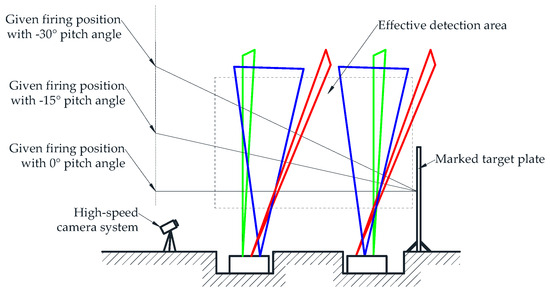 Generally, investigations into protective materials often focus on how to reasonably and scientifically estimate the damage after impact of a small flying object (e.g., fragmentation, meteorite, hail, projectile, etc.) with a high velocity [1,2]. Accurately obtaining key parameters such as the hit position, flight speed, and attitude angle can provide some important references for improving the protective performance of the material [3]. Obviously, a non-contact measurement method should be used to obtain the above-mentioned key parameters. Otherwise, it will lead to serious deviations in these key parameters, thus affecting the accuracy and objectivity of the evaluation of the damage effect [4,5]. If a small flying object hits the surface of a target perpendicularly, this will cause the maximum damage to the protective material layer of the attacked target. Obviously, this can provide some scientific reference to improve the performance of the protective material. Generally speaking, the trajectory of small flying objects cannot be completely perpendicular to the protected target surface due to some disturbance factors. Typically, protected objects are often larger in volume, such as protective shelters, aircraft skins, windshields, and shellproof armor. This requires the ability to effectively, accurately, and reliably measure the above key parameters within a large area (e.g., 5 m × 5 m or even larger). Therefore, this presents a greater challenge to existing relevant measurement methods.