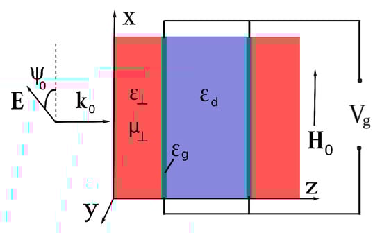 Planar photonic crystal structures with various combinations of their constituent layers have attracted close attention of researchers due to their capabilities for effective control of optical radiation [1,2,3,4,5]. Control of reflection and transmission spectra for such structures, as a rule, is achieved by including layers in their composition, the material parameters of which depend on easily variable external factors (electric and magnetic fields, angle of incidence and polarization of incident radiation) [6,7,8,9,10]. Photonic crystal structures are used to create a wide class of radiation control devices (filters, switches, modulators), performing the function of filtering and amplifying various types of propagating waves [11,12,13,14].