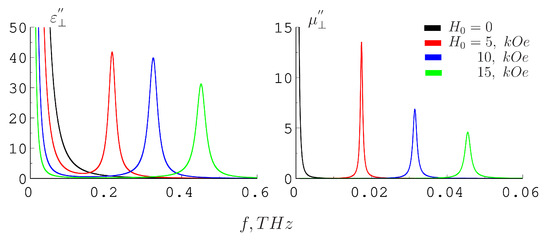Figure 2 shows the frequency dependences of the imaginary part of the effective permittivity and permeability obtained at kOe (black, red, blue, green curves), which correspond to absorption lines at cyclotron and ferromagnetic resonances. The maxima of these dependencies lie in the low-frequency terahertz region for permittivities and in the microwave region for permeability. The maxima of these dependences correspond to cyclotron and magnetic resonances. It is possible to control the material parameters of an effective medium using a magnetic field; this follows from the given dependencies. In this case, an increase in the external magnetic field shifts the resonance curves to higher frequencies.