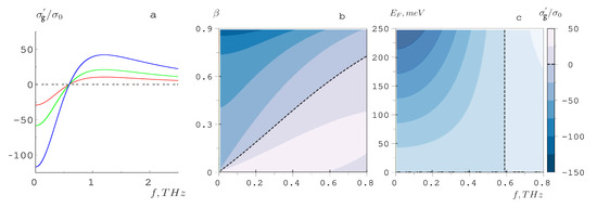 Figure 3 shows the dependence of the conductivity real part of graphene on the frequency (a), obtained on the basis of Equation (4) for the values , meV (red, green, blue curves) and m/s, ps. Figure 3b,c shows the conductivity maps of the dependences and , which make it possible to determine the conductivity value for any values of the specified parameters. Dotted lines separate positive and negative values . Thus, the real part of the conductivity takes negative values and graphene becomes an amplifying medium in the frequency range THz at non-zero Fermi energy values. The combination of the frequency ranges of graphene amplification and the resonances of the material parameters of a magnetic semiconductor indicates that using an external magnetic field it will be possible to control the optical characteristics of a photonic cell.