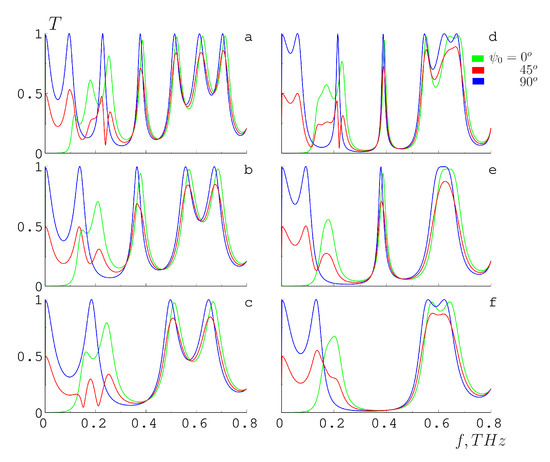 Figure 6 shows the frequency dependence of the transmission and reflection coefficients at the angles of polarization plane orientation of the incident wave (green, red, blue curves), which were obtained for a photonic cell with , meV and kOe.