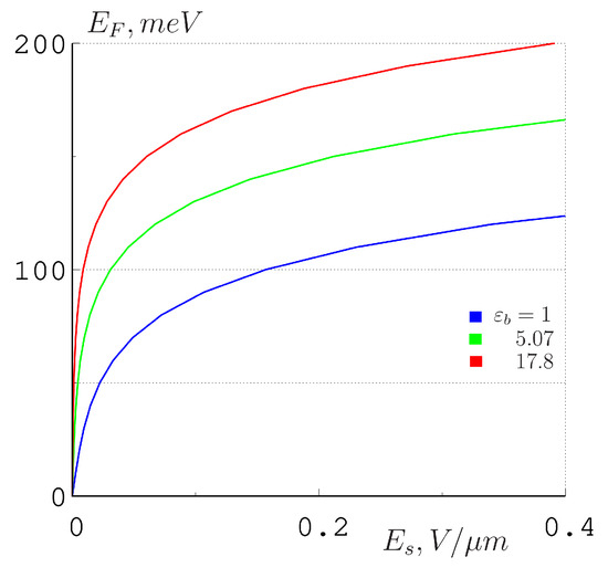 Figure 5 shows the dependence of the Fermi energy of graphene on the external constant electric field strength for nm and the permittivity of the substrate, respectively, for vacuum, SiO2 and (blue, red, green curves). It can be seen that with an increase in the external static field applied to the graphene layer, the value of the Fermi energy increases the faster, the greater the permittivity of the substrate . In further numerical analysis, we assumed to use as a substrate for graphene SiO2 (green curve).
