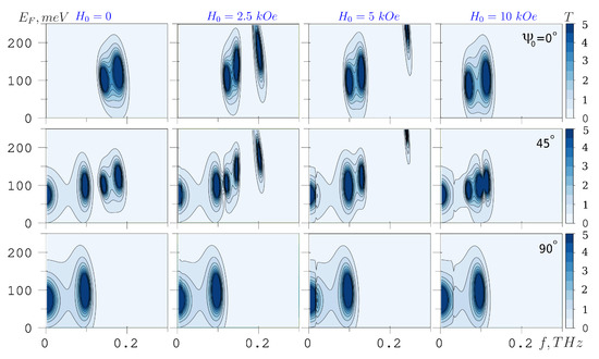 Figure 7 shows a map of the transmission coefficient when a linearly polarized wave is incident on a PC for three orientations of the polarization plane . The thickness of the air gap of the cell is taken equal to . These maps determine the dependence of the coefficient T on frequency and Fermi energy at external magnetic field values kOe. For a clearer image of the amplification regions, we selected the low-frequency part of the spectrum and the transmission coefficient scale was limited to the value . Representing the transmission spectrum with tone diagrams makes it possible to convey the continuous dependence of the coefficient T on two parameters at once: frequency and Fermi energy. In particular, for the given values of and the regions of the parameters f and are visible, where the amplification of the radiation propagating in the photonic cell is most effectively manifested.
