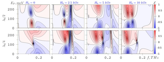 Figure 9 shows contour plots that determine the dependence of ellipticity as a function of frequency and Fermi energy for two values of the thickness of the air gap between the graphene layers . Constant values of the magnetic field are marked in the figure, as well as lines of equal ellipticity levels. It can be seen that with an increase in the magnetic field, the transmitted right-handed polarized radiation changes to left-handed polarized; centers are also visible in which the ellipticity reaches maximum values , which corresponds to the degeneration of the ellipse into a circle with the corresponding direction of traversal of the electric field vector.