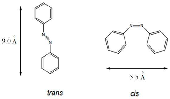 Azobenzene is an organic compound with the chemical formula C6H5N=NC6H5, and it consists of two benzene rings bound by a nitrogen−nitrogen (-N=N-) double bond, which is known as the azo group [57]. Azobenzene groups present two distinct structural forms: the trans and the cis form, as shown in Figure 4. These forms are distinguished in the spatial arrangement of their atoms; specifically, the orientation of the nitrogen−nitrogen (N=N) double bond rings on either side of the molecule are aligned in a straight line, which gives the molecule a longer and extended shape. However, in the cis form, the N=N double bond is bent, bringing the two benzene rings closer together and giving the molecule a more compact, bent structure.