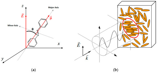 In 1984, Todorov and his collaborators [62] described for the first time the formation of photoinduced birefringence by linearly polarized light in polyvinyl alcohol (PVA) mixed with the polar orange methyl chromophore. Results demonstrated that the photoinduced photoisomerization process gives rise to alignment of dipolar chromophores in the direction perpendicular to the polarization of the light electric field which consequently creates photoinduced birefringence in the medium. This process is a statistical approximation, since a chromophore preferentially absorbs light polarized along the axis of its dipole. The major axis of the molecule, with the probability of absorbing photons, is proportional to cos2θ, where θ is the angle between the direction of the electric field of light and the molecular dipole moment [63], as demonstrated in Figure 5a. Thus, the chromophores oriented in the direction of polarization of light absorb the light with a greater probability, unlike those which are not oriented perpendicularly and are not able to absorb this light and experience isomerization (see Figure 5b).