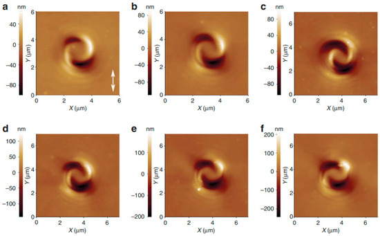 Spiral relief patterns obtained for different illumination doses from a Gaussian laser beam injected into a microscope. AFM images of the topographical structures were obtained with the varying illumination intensity and fixed time of exposure (and polarization direction) for topological charge ℓ = 10. The white arrow indicates the polarization direction. Different panels correspond to different values of the laser power injected in the microscope: (a) 15 mW; (b) 18 mW; (c) 21 mW; (d) 29 mW; (e) 41 mW; (f) 54 mW. Similar results were obtained for varying the time of exposure at a fixed intensity. Reprinted from [121].