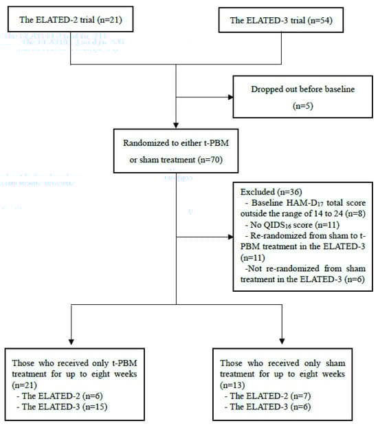 The ELATED-2 trial was an 8-week double-blind, sham-controlled trial that enrolled 21 patients aged 18–65 years diagnosed with major depressive disorder (MDD), according to the Diagnostic Statistical Manual, Fourth Edition (DSM-IV). These patients had a baseline HAM-D17 total score that ranged from 14 to 24. The patients were assigned to receive either t-PBM with near-infrared (NIR) or sham treatment twice a week for 8 weeks, for a total of 16 sessions. The 16-item Quick Inventory for Depression Symptomatology, Self-Report (QIDS-SR16) and HAM-D17 were assessed at baseline and weekly thereafter.