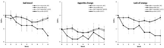 In the patients who responded to t-PBM treatment, there was a 50% or greater improvement observed in the QIDS-SR16 or QIDS-C16 scores for all symptoms besides sleep—onset insomnia, mid-nocturnal insomnia, and early morning insomnia after 8 weeks of treatment as compared to the baseline in the LOCF analysis (Supplementary Figure S1). Moreover, the responders exhibited improvement rates of over 75% for symptoms including sad mood, appetite change, difficulties with concentration and decision making, lack of energy, slowing down, and restlessness. Figure 2 illustrates the trajectories of some typical symptoms over time. In contrast, among the patients who did not respond, only hypersomnia showed a 50% or greater improvement.