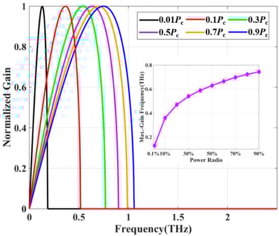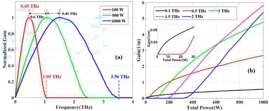 Figure 3a. Compared with 100 W and 500 W, the peak gain frequency is blue-shifted by 0.6 THz and 0.45 THz. It can be seen that, with the increase in total power, the increased rate of peak gain frequency in the gain spectrum gradually slows down.