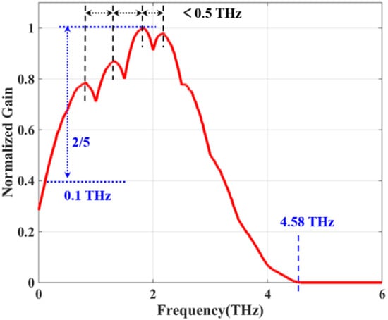 P of 100 W. The frequency range of the gain spectrum induced by MI is 0–1.05 THz, and the peak gain frequency is 0.45 THz. The frequency range of the gain spectrum at 1000 W power is 0–3.56 THz, as shown by the blue curve in