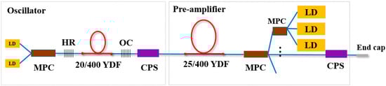Figure 6. The system consists of a short-gain fiber seed source and a main amplifier. The seed source includes an oscillator and a pre-amplifier. The resonator in the oscillator consists of a high-reflectivity fiber grating (HR-FBG), a low-reflectivity fiber grating (OC-FBG) and a 1 m ytterbium-doped fiber (YDF, core/cladding diameter: 20/400 μm; NA: 0.06/0.46; the cladding’s absorption coefficient near 975 nm is 1.20 dB/m; bending radius: 40 mm). The central wavelength of HR-FBG is 1080 nm, the spectral bandwidth of 3 dB is 2.05 nm and the reflectivity is greater than 99%. OC-FBG has a central wavelength of 1080 nm, a 3 dB spectral bandwidth of about 0.09 nm and a reflectivity of about 13.2%. The forward pumping source of the seed source consists of two 130 W wavelength-locked semiconductor lasers (BWT, Beijing, China), and pumped lasers are injected into the resonator through a (2 + 1) × 1 pumping combiner (Juhere Photonics, Wuhan, China). The OC’s output fiber tail was connected to the gain fiber of the preamplifier using a cladding optical stripper (CPS). A YDF with a length of 2.5 m (25/400 μm; NA 0.065/0.46; 4.3 dB/m@975 nm) was used in the preamplifier. A (6 + 1) × 1 reverse beam combiner (Juhere Photonics, Wuhan, China, HSP-61-B-M12-D07) was used to couple three wavelength-locked semiconductor lasers (BWT, Beijing, China) with a maximum output power of 130 W into the preamplifier. The output fiber of the reverse beam combiner (25/250 μm) was fused with the CPS, and the output was finally mitered at 8°. The total length of the output energy transmission fiber was about 3 m. The output power was measured using a Spiricon power meter, the spectral and temporal characteristics were measured using a YOKOGAWA spectrometer and a Tektronix oscilloscope, respectively, and a photodetector (Terahertz Technologies, Suzhou, China, TIA-525I-FC) was used to convert optical signals into electrical signals.