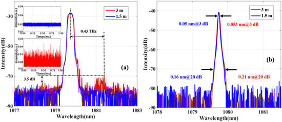 Figure 7b that, when the power is 100 W, the 3 dB linewidth of seed sources with fiber lengths of 1.5 m and 3 m is 0.05 nm and 0.053 nm, respectively. The spectral curve is measured with a 9/125 μm single-mode patch cord. Since the wavelength resolution measured with a 400 μm core diameter patch cord is only 1 nm, while the wavelength resolution measured with a 9/125 μm patch cord is 0.02 nm, a patch cord of 9/125 µm is, therefore, more suitable for spectral linewidth measurement [