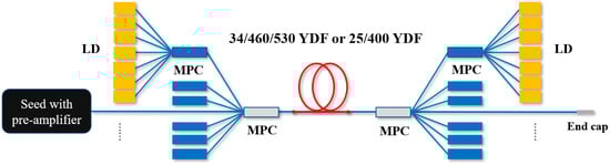 The gain fiber of the main amplifier 1 uses a YDF with a core/inner cladding diameter of 25/400 μm and a length of 9 m. The numerical aperture of the core/inner cladding of the gain fiber is 0.06/0.46 and the pumping absorption coefficient is 4.3 dB/m@975 nm. The first main amplifier uses a double-ended cascade pump structure. A total of 73,976 nm non-locked wavelength semiconductor lasers (BWT, Beijing, China, 976 nM-140) serve as pump sources. Pump light is coupled into a (6 + 1) × 1 forward beam combiner (Juhere Photonics, Wuhan, China, HSP-61-F-M12-D03-D07) and a (6 + 1) × 1 reverse beam combiner (Juhere Photonics, Wuhan, China, HSP-61-B-M12-D07-D04), respectively, via a 7 × 1 cascade pump combiner (Lightcomm, Shenzhen, China, 7 × 1-S2), and is then injected into the amplifier gain fiber. The positive and negative power ratio is 1:1. The amplified laser is finally output at the fused quartz endcap (QBH). The structure of the second main amplifier is the same as that of the first main amplifier, and the gain fiber is changed to a YDF with a core/inner cladding/outer cladding diameter of 34/460/530 μm and a length of 8 m. The numerical aperture of the core/inner cladding/outer layer of the gain fiber is 0.11/0.22/0.46, and the pump absorption coefficient is 4.3 dB/m@975 nm. The (6 + 1) × 1 forward beam combiner (Juhere Photonics, Wuhan, China, HSP-61-F-M12-D05-T12) and (6 + 1) × 1 reverse beam combiner (Juhere Photonics, Wuhan, China, HSP-61-B-M12-T12-T01), matched to the corresponding fiber, are replaced at the same time.