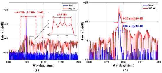 Figure 9a shows the spectrum of the pre-amplified seed light when the power is 100 W and the spectral SNR is greater than 45 dB. The experimental results from the above section show that there is no MI in the seed light at this time. The red curve in