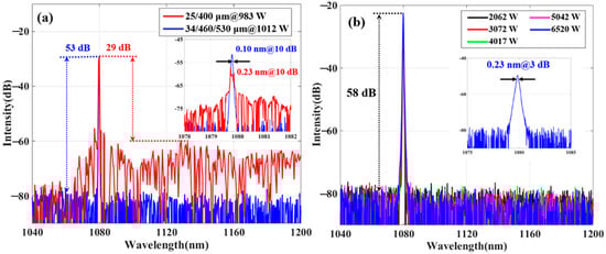 Figure 10a show the spectral linewidth of the fiber at 25/400 μm and 34/460/530 μm, respectively. Due to the cascaded MI, the 10 dB linewidth of the seed light is broadened from 0.09 nm to 0.23 nm after being amplified by a 25/400 μm fiber amplifier, and the main peak of the signal light as the pump light is split by the cascaded MI with a strong increase. However, the 10 dB linewidth of the seed light amplified by the 34/460/530 μm fiber amplifier is only widened by 0.01 nm. When the output power of the triple-clad fiber laser experimental system is amplified to 6520 W, the spectral diagram is obtained, as shown in