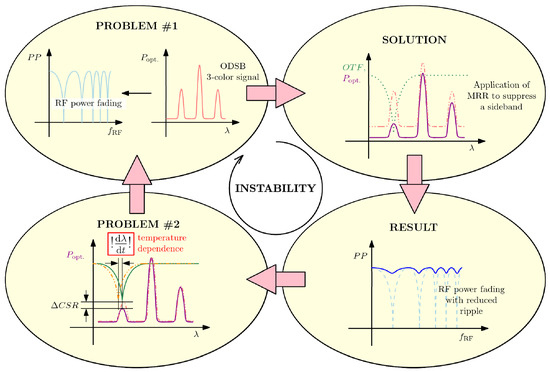 Figure 1 shows a cyclic causation diagram. The primary problem (#1) is addressed by the MRR-enabled sideband suppression, causing the undesired RF power fading to reduce to an acceptable level. Unfortunately, due to the temperature dependence of a PIC and its hosted MRR (problem #2), the solution becomes ineffective over time and the primary problem is invoked once again. We can then repeat the tuning procedure we took in the first place to realign the system, but the issue will arise again. We conclude that the system is indeed unstable due to the temperature dependence of the MRR.
