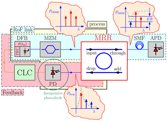 Block diagram showing a RoF link (turquoise polygon), a feedback topology (pink polygon), the process (beige polygon) under closed-loop control and the add/drop MRR enabling the sideband suppression and thereby limiting the power fading.