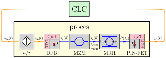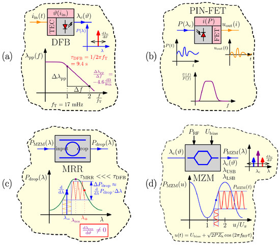 The process with its constituent parts: A voltage-controlled current source (VCCS), a DFB, a Mach–Zehnder modulator (MZM), an MRR and a PIN-FET receiver.