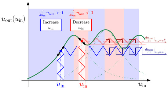 The input voltage signal consists of a manually set bias voltage , a slow-changing yet dynamic bias voltage from the integrator and a triangle wave voltage of a certain frequency and amplitude. The latter is intended for continuous sensing of the derivative sign. Given the desired near-DC behavior of , we will merge it together with into a single DC term , which yields: