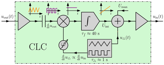 Figure 6 shows the block diagram of the proposed CLC system. Let us assume that the integrator’s output is neutral right after the startup. At this point, the signal comes solely from the triangle-wave generator. As this signal from the input propagates through the process, we obtain either an in-phase or out-of-phase triangle wave signal at the output . Then, the derivative is taken and multiplied by the derivative of the original triangle wave . If these two are in-phase, the product is positively biased, while when out-of-phase, the product is negatively biased. This causes the integrator to chirp either up or down. In practice, there can be an additional phase shift at , which might need to be compensated by adding a relative phase shift to the reference signal . When the maximum point is reached, the product loses the DC component; therefore, the output of the integrator remains constant, as required. To determine the time constants of these building blocks we must consider the following. First, the exciting triangle wave signal should be slow enough not to be filtered out by the low-pass response of a TEC element. Therefore, we propose a time constant in a similar range, about . The integrator, on the other hand, should be slow enough to be filtered out by the high-pass filter at the input, i.e., .